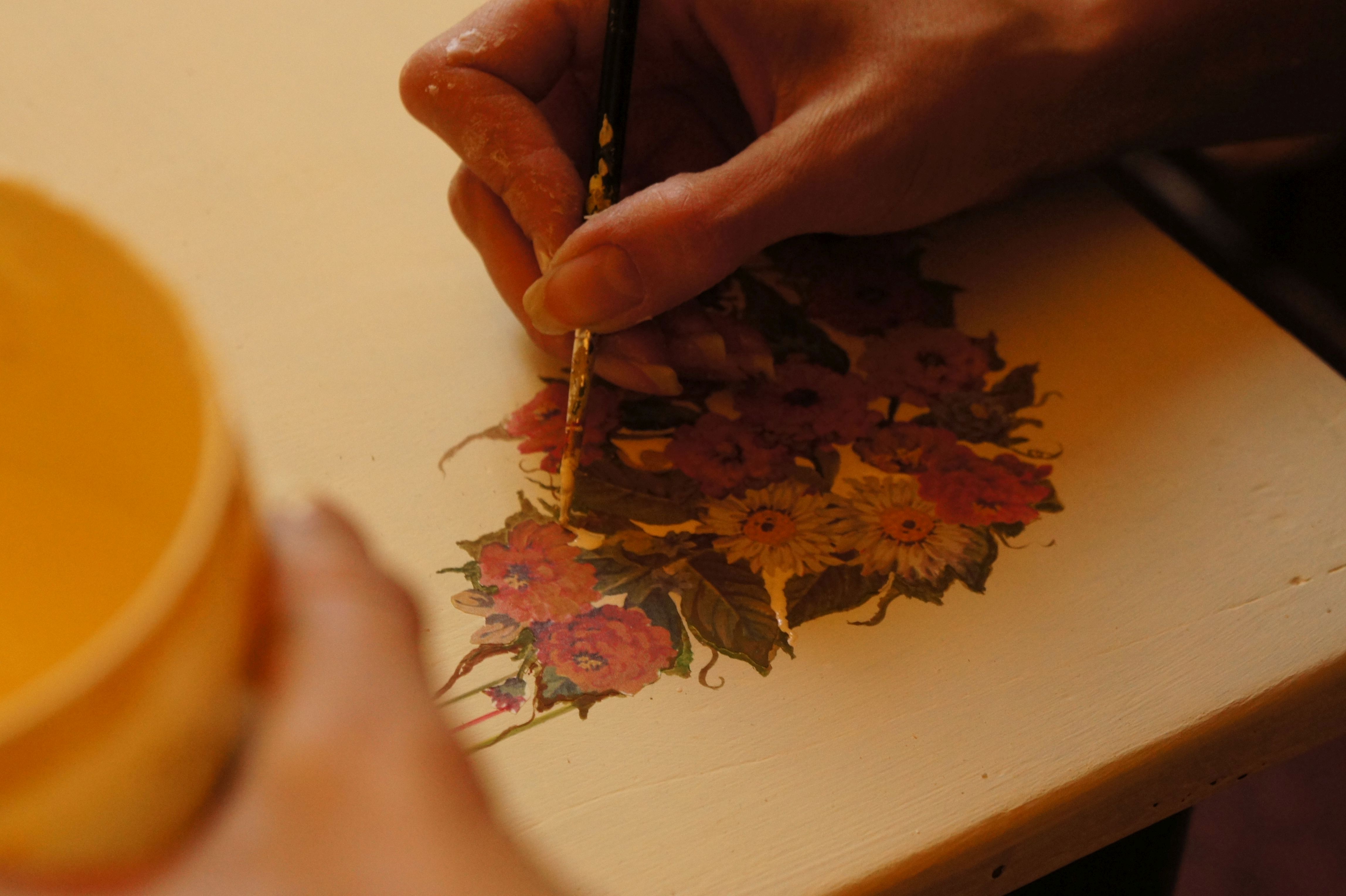 Decorazione a mano di mobili, sedie, ceramica e tessuti.